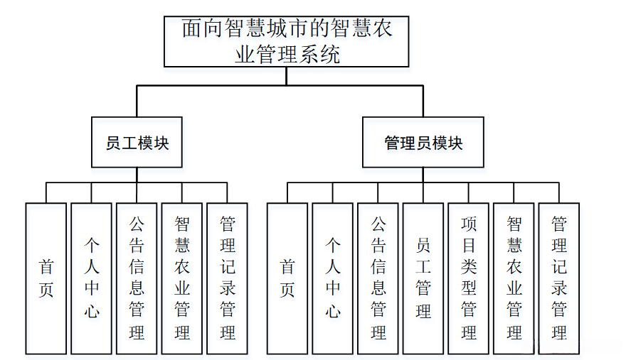 为了更清晰地整理本系统整体思路,并对该系统进行结构图的呈现形式设计与实现,在面向智慧城市的背景下具体设计并实现智慧农业管理系统的功能结构图如下所示: