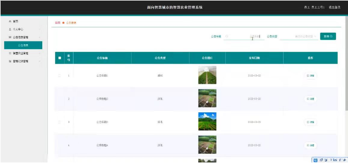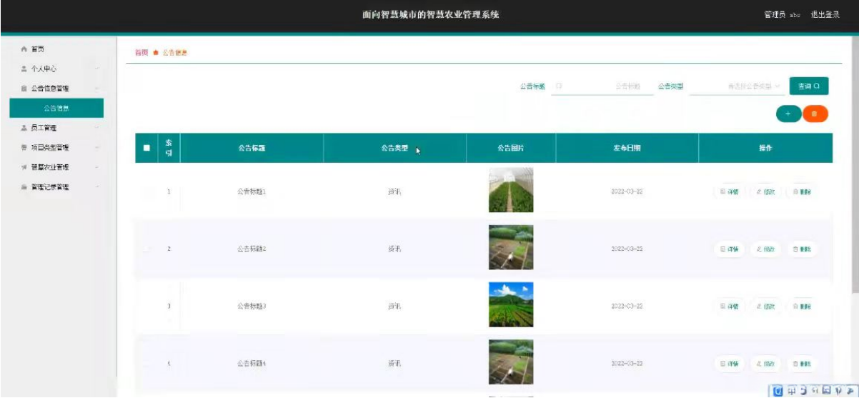 在公告信息的管理模块中,在于某个特定页面上能够实现对索引项、标题、类型、图片信息以及发布时间等各项数据的详情查看、内容修改以及删除操作,并如图5-3所示