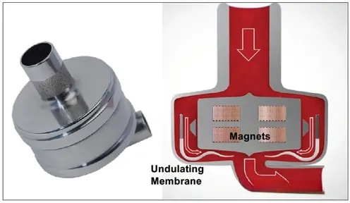 该医疗设备由Thoratec公司研发而成,在全球范围内处于领先地位。该装置采用先进的磁悬浮技术,在心脏腔内实现了完全内置于血管中的泵体结构。基于磁悬浮原理运行的泵体设计具有较宽的输送通道,在不影响正常血液循环的同时最大限度降低血液剪切力水平。无需机械轴承支撑的无接触运行模式有效降低了磨损与发热问题;而人工脉冲设计能够有效防止血液积聚与凝血现象的发生,在维持正常循环节律的同时也能够降低血栓生成的风险