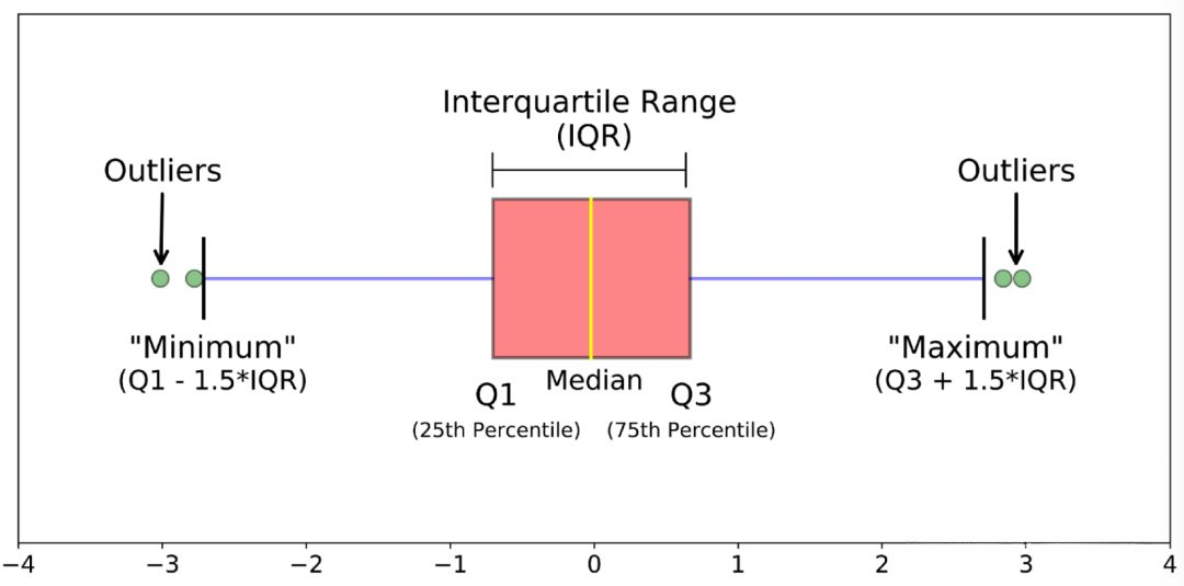 在箱线图中,中间是一个箱体区域,并被标注为粉红色部分。左侧、中央和右侧各有一条标记线:左侧代表下四分位数(Q₁),右侧代表上四分位数(Q₃),中央位置则是中位数值(Median)。上下两个四分位数值之间的差即为内距四分位间距(IQR)。通过计算 Q₁ - 1.5 × IQR 确定最低边界线的位置;而 Q₃ + 1.5 × IQR 则标定最高边界线的位置。超出最高边界线的数据被视为极大异常点;低于最低边界线的数据则被认为是极小异常点;因此,在上下两个边界之外的观测数据都被视为异常点。