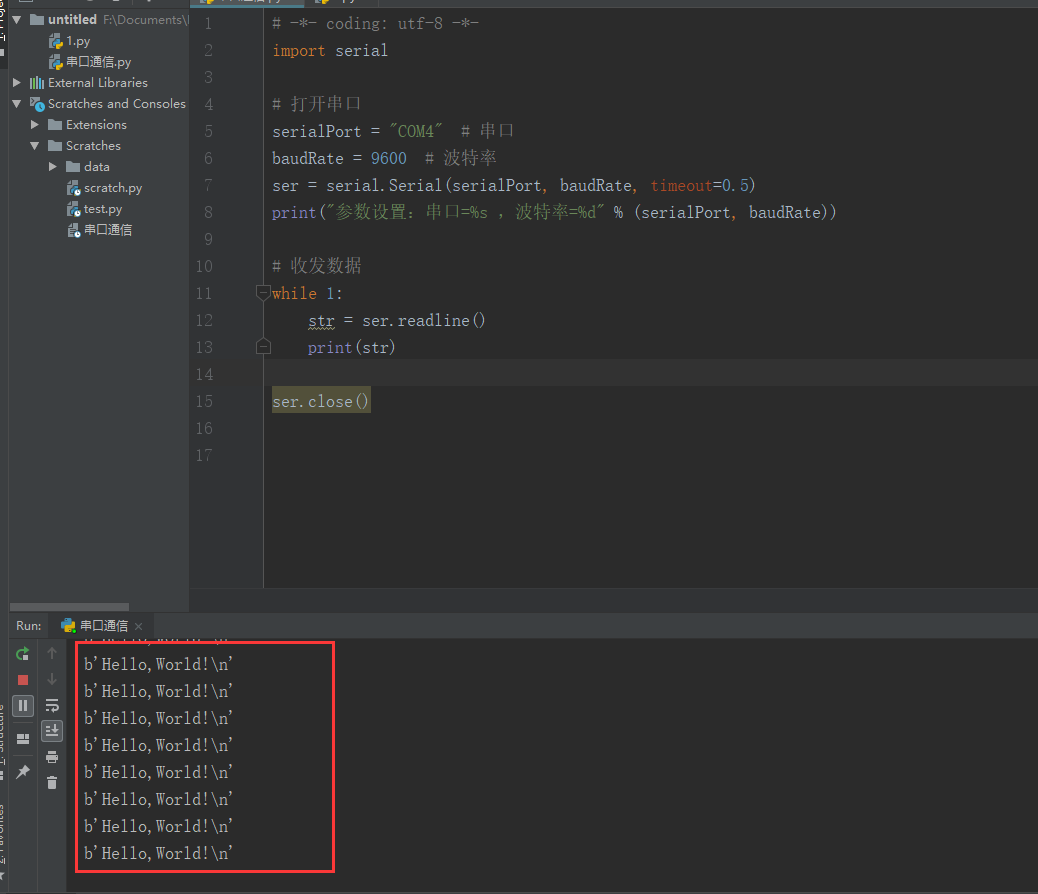 图7 python端代码和运行结果(由于此处我是COM4串口就设置的是COM4)