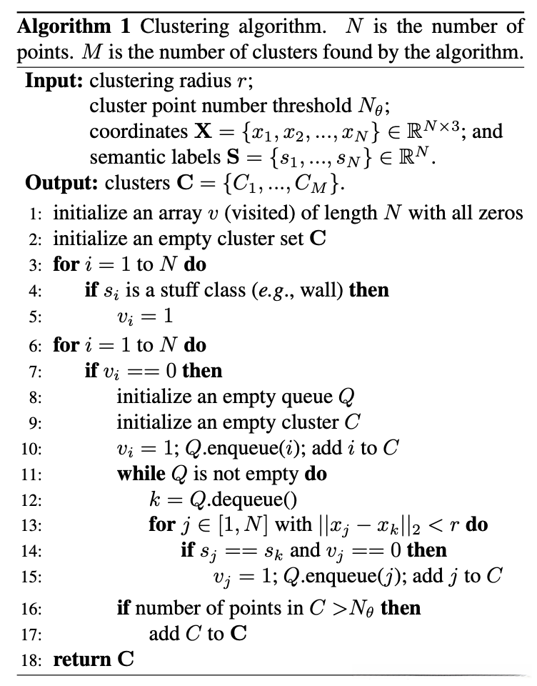 - 输入参数聚类半径r;聚类点的阈值Nθ;原始坐标和语义标签。