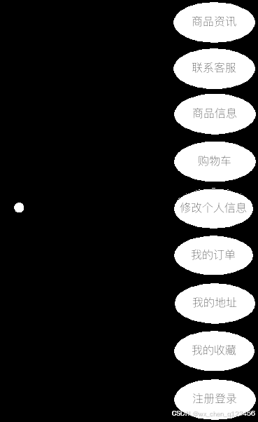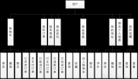 设计的用户的详细功能见下图,用户管理收货地址,管理不同状态的订单,收藏商品,购买商品。