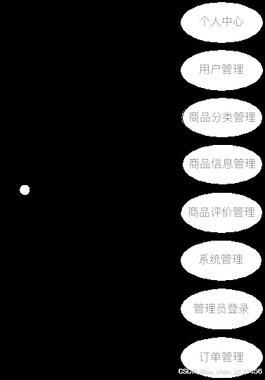 林业产品推荐系统设置了管理员权限,其用例图见下图。管理员登录进入本人后台之后,管理商品和用户,管理商品评价和商品资讯,管理不同状态的订单。