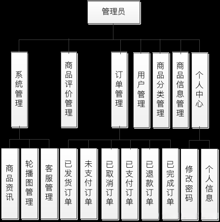 设计的管理员的详细功能见下图,管理员登录进入本人后台之后,管理商品和用户,管理商品评价和商品资讯,管理不同状态的订单。