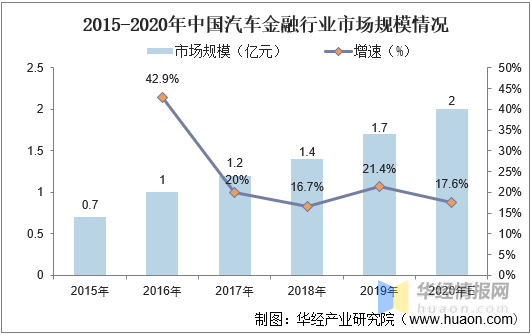 汽车金融市场的主体主要包括汽车金融服务公司、商业银行、汽车财务公司、信托公司、信贷联盟、汽车租赁公司和汽车保险公司等。伴随着新车销售的高速发展和市场消费的不断进步,近十年来我国汽车金融市场规模快速增长,2019年中国汽车金融市场规模为1.7万亿元,同比增长21.4%,预计2020年市场规模将达到2万亿。