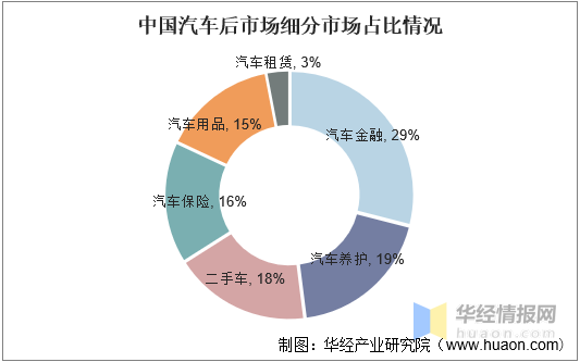 从细分市场占比情况来看,汽车金融市场是汽车后市场最大的细分市场,占比达29%。其次是汽车养护市场和二手车市场,占比分别为19%和18%。