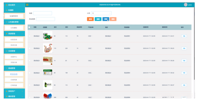 商城管理,在药品信息列表可以查看药品信息、封面图、卖价、原价、库存、分类、药品规格等信息,如图5-4所示。
