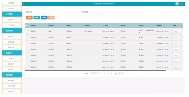 预约信息管理,在预约信息列表可以查看医生姓名、医护类型、联系方式、预约用户、上门时间、预约状态、备注等信息,并可根据需要进行修改或删除操作,如图5-6所示。