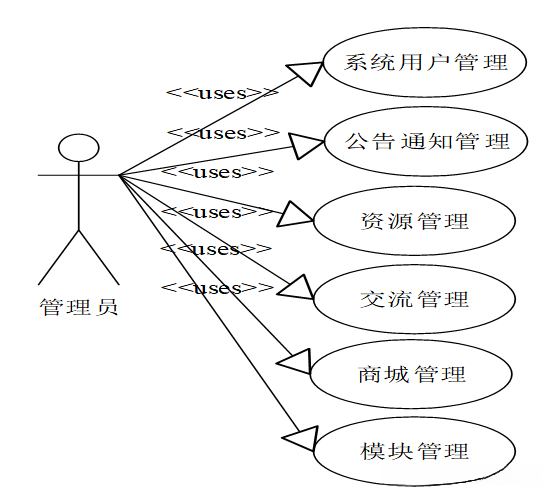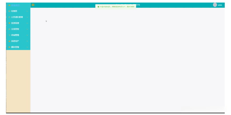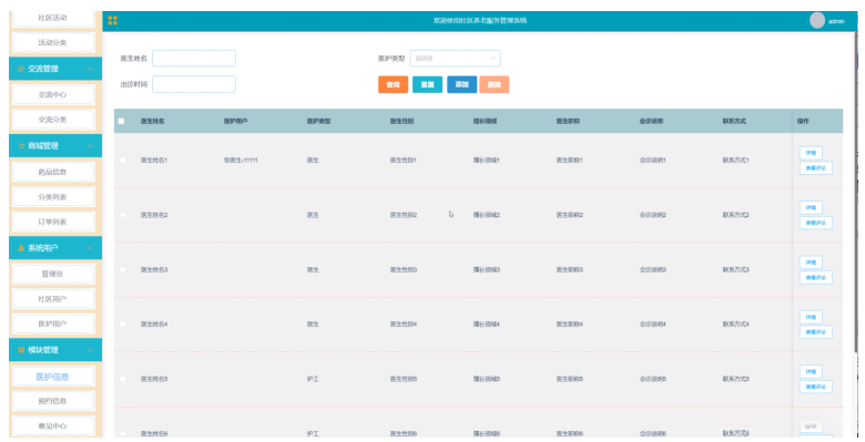 管理员登录进入人力资源管理系统可以查看管理员:公告管理、交流管理、商城管理、用户管理(管理员、社区用户、医护用户)、模块管理(医护信息、预约信息、意见中心)管理等内容,如图5-2所示。