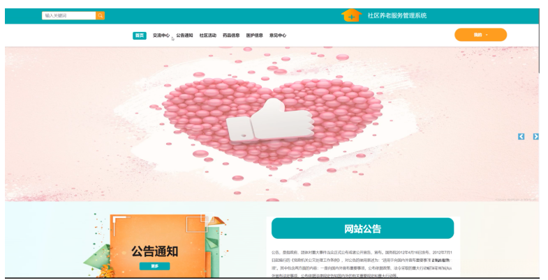 With the arrival of the internet trend, various industries are considering using the internet to promote themselves. The best way is to establish their own internet system, maintain and manage it. In practical applications, the working rules and development steps of the application software are constructed using the Springboot framework to build a community elderly care service management system. This design mainly implements an elderly care system that combines the advantages of humanization, efficiency, and convenience, completing functional modules such as announcement notification, community activities, communication management, mall management, and module management (medical information, appointment information, opinion center). The system communicates with the server through a browser to achieve data interaction and changes. You only need to use a computer and move your fingers to operate the system, achieving data communication management. The design process of the entire system platform fully considers issues such as data security, stability, and reliability, and the operation process is simple. This system improves work efficiency and reduces errors and omissions in data storage through scientific management and convenient services.