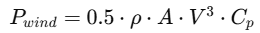 其中,𝑃𝑤𝑖𝑛𝑑是风力发电的功率,𝜌是空气密度,𝐴是风轮扫掠面积,𝑉是风速,𝐶𝑝是功率系数。
