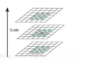 (2)检测尺度空间极值点。在寻找尺度空间中的极值点时,每个采样点需要与其所有相邻的区域进行对比分析。具体而言,在二维图像的空间域和尺度域上都要满足极值条件才能被识别为特征区域。具体实施时,在中间区域位置需要与周围8个邻域区域以及上下两个层级对应区域(共26个区域)进行对比分析。只有当该区域在DOG尺度空间及其上下两个层级中达到最大或最小值时才被确定为图像的关键特征区域。