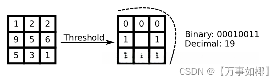 在每个cell中的每一个 pixel 处,在其邻域内计算所有 8 个相邻 pixels 的亮度值,并与当前 pixel 的亮度值进行比较。如果周围 pixels 的亮度值大于当前 pixel 的亮度值,则将其标记为 1;否则标记为 0。
