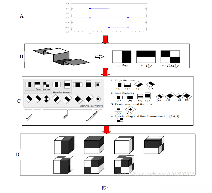 类哈aar特征作为一种在计算机视觉领域广泛应用的核心算法,在理论构建上受到一维haar小波启发的基础上发展而来,并根据其二维特性被命名为Haar-like特征[1]。随后发展出一种三维版本3D Haar-Like特征用于动态视频分析。具体发展历程可参考图1