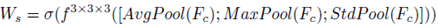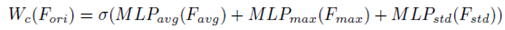 - 通道块:利用了标准差,平均值和最大值三个值。利用了有一个隐藏层的MLP。下式最外层是sigmoid。得到Fc。