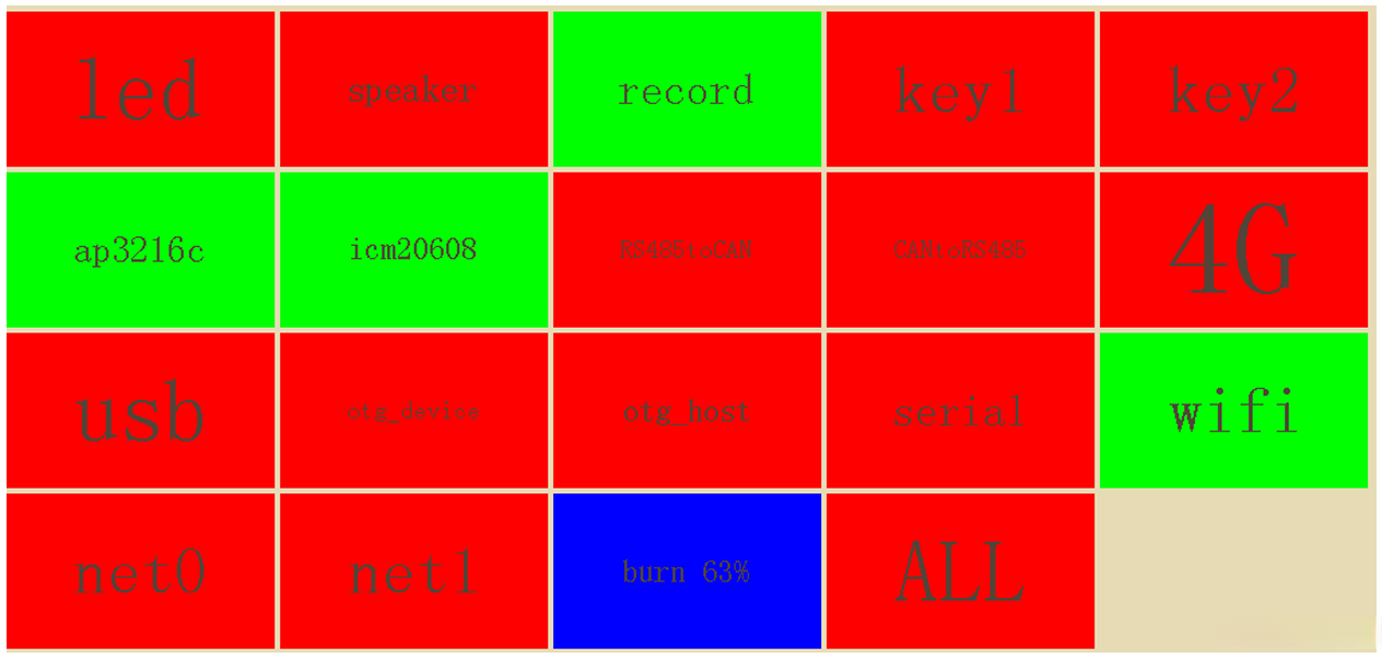将这套软件复制到SD卡上后插入IMX6ULL开发板并启动系统后会立即开始执行各组件的测试以及EMMC系统的烧录流程操作人员只需按照指导说明书连接几个关键模块即可完成整个测试流程以及烧录操作一旦显示完整且所有功能模块标识灯变为绿色则表示测试成功完成