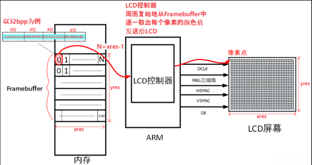 - 控制程序配置LCD控制器: 首先依据LCD参数配置其时序与极性; 然后基于分辨率与位宽分配Frame Buffer。