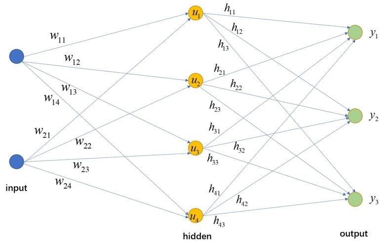 在以上三层网络中,相邻层间的各个神经元均达成全连接状态;即下一层中的每一个神经元均与上一层的所有神经元建立全连接关系;且任何两层之间的各个神经元均无连接关系;其中各层间联系强度构成了网络的权值矩阵W。