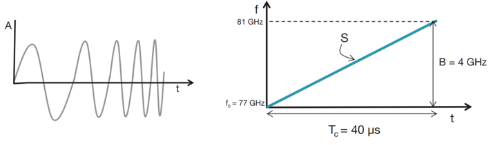 该系统负责生成连续的调频脉冲序列。如图所示,在单个脉冲周期内,信号的频率随着时间线性递增(即线性调频信号)。尽管如此,并非只有线性变化的方式;关键在于信号频率的变化机制。在如图所示的例子中,默认起始频率f_c设定为77 GHz,在持续时间为T_c(通常称为一个Chirp周期)的一段时间内逐步升至81 GHz。在这一过程中所涉及的具体参数包括:该雷达系统的带宽B定义为在一个Chirp周期内频率的变化范围(此处为4 GHz),而其带宽随时间的变化速率S则计算为4 GHz除以40 μs的时间间隔(结果为100 MHz/μs)。