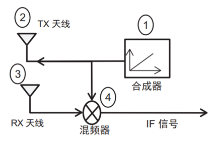 混频器将 RX 和 TX 信号合并到一起,生成 一个中频(IF)信号。
