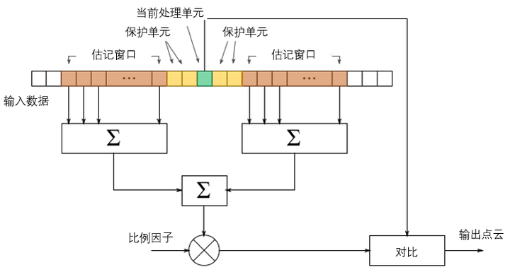 CFAR算法正是基于这一理念而被设计出来的,在此我们将深入探讨具体实施的方法。为了便于理解这个概念,在这里我们依然采用一维数据作为示例来进行说明。对于每一个输入数据中的单元体(如图中以绿色标注的部分),我们需要完成的主要步骤包括以下几个方面:首先计算该单元体邻近区域的所有能量平均值;将该平均能量数值乘以一个预设的比例因子后与当前单元的能量数值进行比较分析;最后根据比较结果判断该区域属于目标点还是背景噪声区域