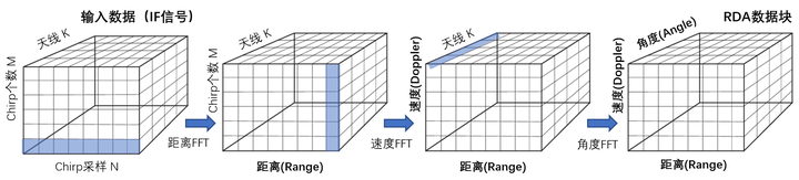 在每一帧周期内,发射系统会发送M个Chirp信号。每个Chirp信号的采样点数为N。相应的接收端有K个接收天线组,在接收过程中会产生K组反射信号。通过混频器处理后,在中频域(IF)得到了一个复合信号。该复合信号具有三维结构特征:行数对应接收通道数目K、列数对应Chirp数量M以及深度维度对应采样点数N。分别对三个维度依次应用快速傅里叶变换(FFT)算法即可提取目标特征信息:距离参数由第一个维度推导得出、速度参数由第二个维度计算得到以及角度参数则来自第三个维度的数据处理结果。生成的目标回波数据矩阵即为此处介绍的那种密集层状数据格式;不过需要注意的是,并非所有算法都需要显式地执行三次FFT运算:例如可以选择保留Chirp时序维度并利用神经网络模型来直接提取速度信息;或者选择保留天线空间分布特性并采用神经网络模型来识别目标角度信息等方法也可以被采用以优化计算效率或提升模型性能