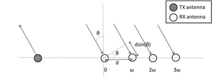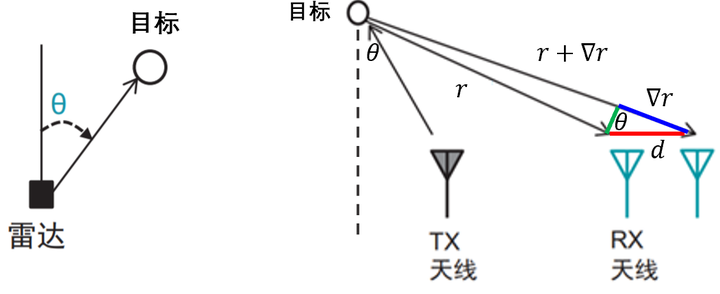 除了距离和速度之外, 另一个关键的信息就是目标相对于雷达的角度θ, 如图所示. 为了精确估计角度θ, 通常需要布置多个接收天线阵列. 不同接收天线与目标之间的距离差异将直接影响到接收到的信号时序发生差异. 接收信号的频率基本保持恒定, 这是因为所有接收到的信号都是基于以毫米刻度量的接收天线间距d进行运算得到的结果, 相对于目标位置所处的距离r来说, 这种间距变化可以忽略不计.
