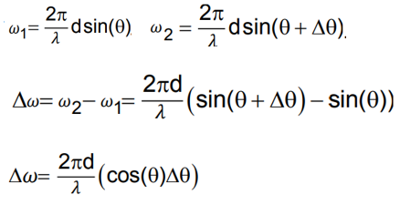 该公式简要阐述了角度分辨率的计算方法。假设场景中有两个目标物点,在方向角θ和平移量∇θ处形成分布,则相应地在信号中会产生两个相位增量ω₁和ω₂。基于三角函数的基本性质可知,在微小角度变化下有sin(θ + ∇θ) - sin(θ) ≈ cos(θ)∇θ这一近似关系成立;因此这两个相位增量之间的差异最终可被表示为:Δω = 2πd/λ * cos(θ) * ∇θ的形式。