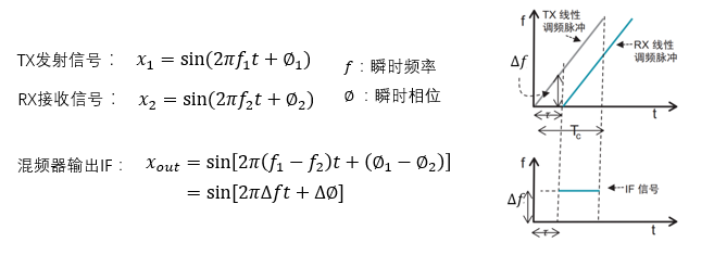 混频器将输入端的发送与接收信号进行结合,并生成一个具有独特频率的新波形(称为中频信号IF)。如图所示,在接收端与发送端所接收到或发出的各个参数均存在差异性特征(这些参数具体由目标物体的距离与运动速度共同决定,在后文将会做详细介绍)。此处通过混频器的作用将这两个不同参数叠加合并在一起形成一个新的综合参数——即新的频率特征与相位特征分别对应着原始发送与接收端之间的Δf值以及Δ∅值等特性参数。在此基础上展开后续所有的数据处理工作就是本章的主要工作内容之一:即从该综合性的中间状态出发去解析识别出被观测目标所具有的距离信息(对应的Δf)、运动速度信息(对应的Δ∅)以及多组接收天线所提供的方位角度信息等关键参数信息。
