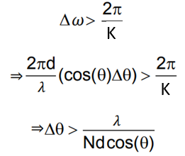 基于傅里叶变换理论,在K点进行FFT处理时所能辨别的最小频率分量大小为2π/K(弧度),其中K值代表接收天线的数量。通过这一计算结果我们可以得出可分辨出的最小角度差异值即为此系统的角分辨率。