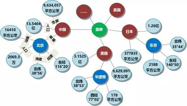 实体: 指的是具有可区别性且独立存在的某种事物。如某一个人、某一个城市、某一种植物等、某一种商品等等。世界万物有具体事物组成,此指实体。如图1的“中国”、“美国”、“日本”等。,实体是知识图谱中的最基本元素,不同的实体间存在不同的关系。
