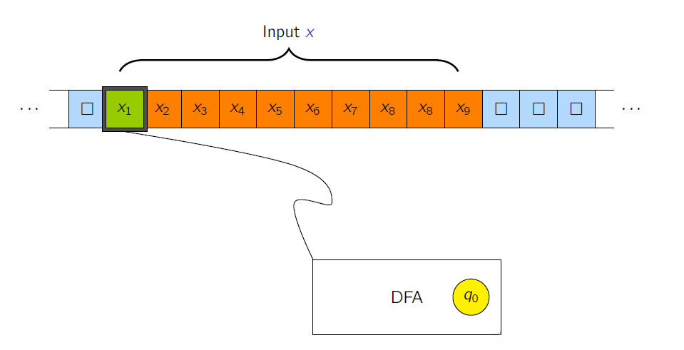 - 然后输出词y\in \Sigma^*可以从带子上面读取:y从读取头开始到第一个空符结束(\Gamma\setminus\Sigma)