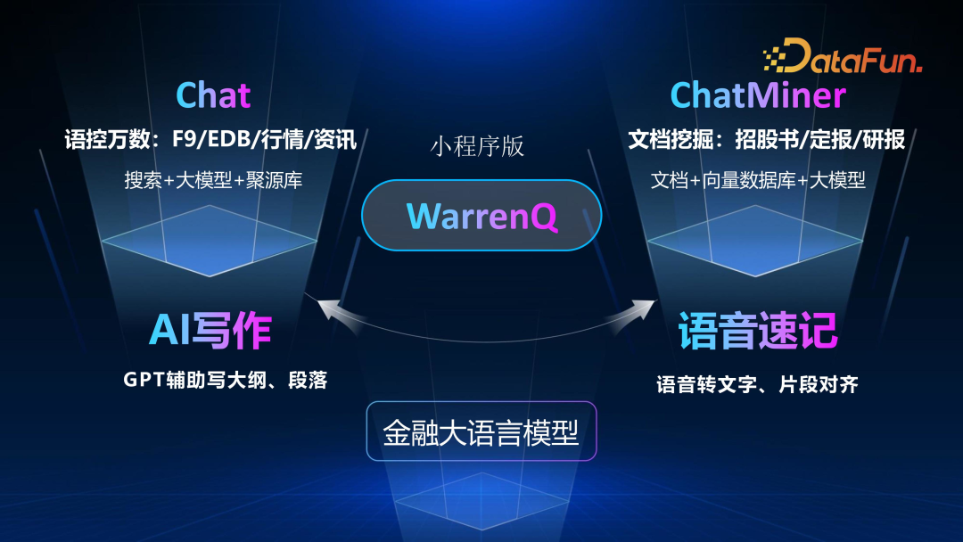 基于搜索+大模型+聚源库,WarrenQ 进一步可实现 AI 写作、文档挖掘、语音速记和片段对齐等功能,而这些功能都是由大模型提供底层支撑。对于上层应用,除了 PC 版本之外,还提供了小程序版本。以上就是恒生在大模型应用实践方面的现状。