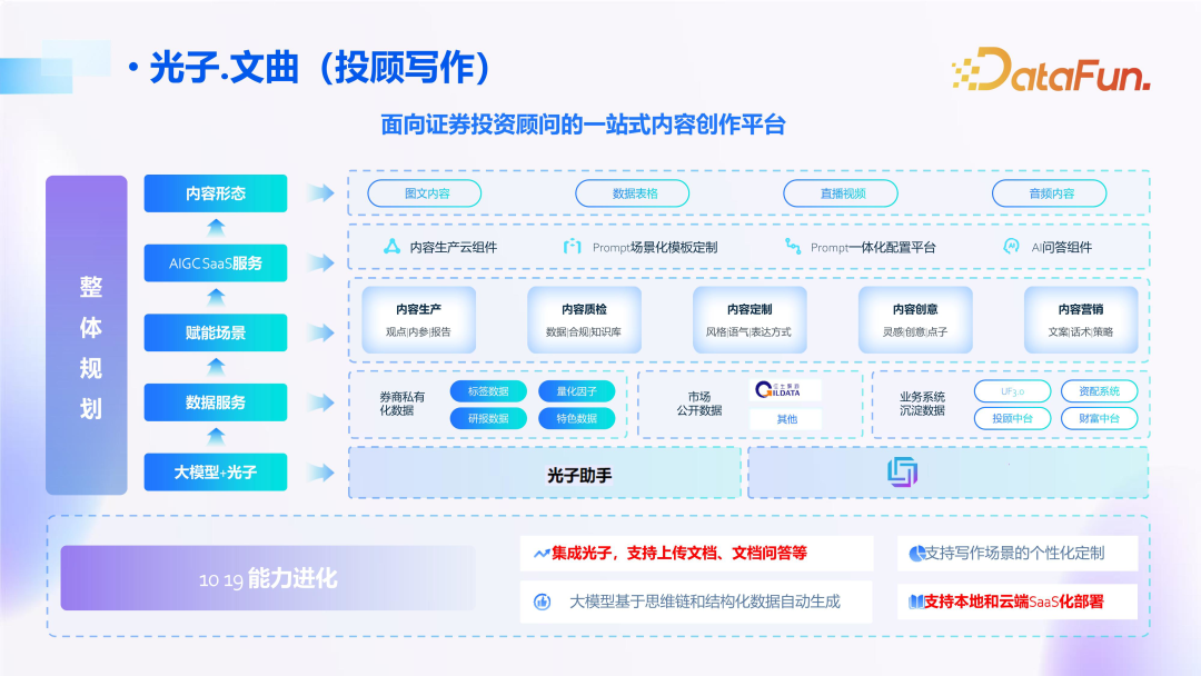 前文所述的中控(也叫光子)部分,该插件会提供数据间“共性能力”的支撑,赋能投顾、客服、运营、合规交易等微场景,这是恒生大模型的整体蓝图 。