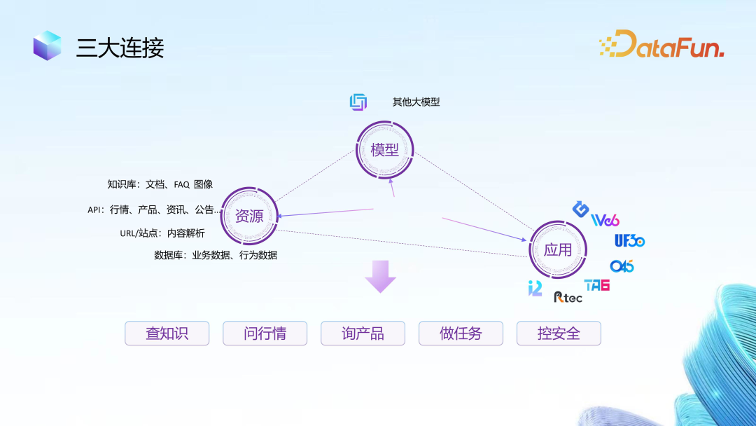 上图中,左边部分主要来自外部,而右边部分基本都来自企业内部,包括内部文档、内部数据库、内部知识图谱以及内部系统的开放接口等。