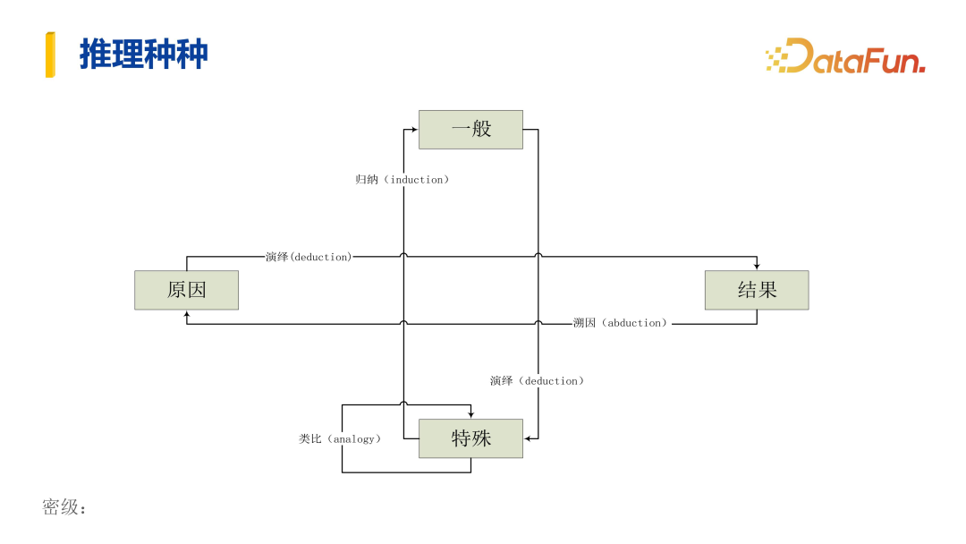而在自动化的过程中,推理可以进一步分为两类,一类推理是描述特殊和一般的关系(上图中的纵向),包括归纳(从特殊到一般)、演绎(从一般到特殊)和类比(从特殊到特殊)等;另一类推理则描述原因与结果的关系(上图中的横向),从原因到结果的推理是正常的演绎路径,而从结果到原因的推理则是溯因路径。
