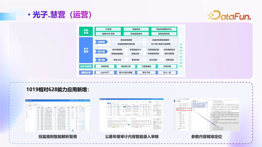 第四是运营场景,主要涉及对文档的处理,特别是对扫描后的合同文档进行关键参数提取,并在此基础上进行人工校对,不仅要检查已提取的参数,同时要对照原文,审查其来源出处,并检查其原始影像的质量,从而确保校对的准确性和完整性。这样能够在保证数据准确无误的同时,最大程度地提高工作效率。而运营场景也正在不断扩展,模型正在尝试使用一句话实现复杂的、具有多层菜单结构的操作步骤,这也是未来工作的一大方向。