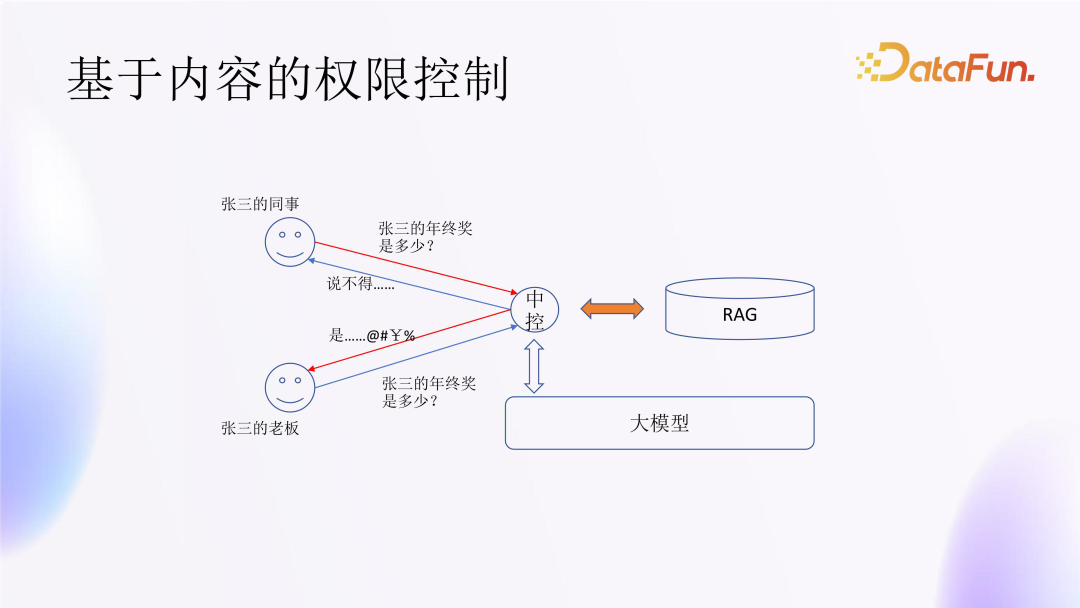 然而,如果将员工个人信息都嵌入到大模型中,会出现“张三的年终奖有多少”这类涉及隐私的问题,而问题可能是张三的同事提出的,也可能是张三的老板提出的。如果是张三同事或其他人问的,出于对员工隐私的保护,应不予回答;如果是其老板问的,则应该如实回答。那么,大模型该如何区分这个问题该如何回答呢?