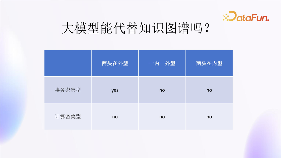 将事务密集型模式和计算密集型模式结合起来,同时考虑数据来源和数据去向,对应用场景进行分类,会形成上表这种 2*3 的分类方式。这 6 类应用场景,其中只有事务密集型且“两头在外”的这类应用场景可以使用大模型来替代,其余 5 类场景则无法使用大模型完全替代。因此,知识图谱在很多场景下还是不可或缺的。
