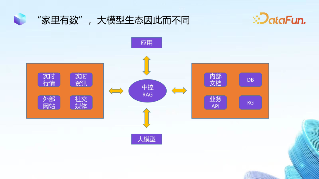 大模型和应用之间会有一个以 RAG 为核心的中控,用来搭接外部数据和内部数据,起到“连接四面八方”的作用。
