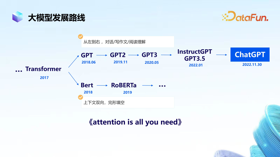 大模型的发展包括两条技术路线,一条是 OpenAI 为代表的 GPT 路线,一条是以谷歌为代表的 Bert 路线。这两条路线,一个是所谓单向的,一个是所谓双向的。从去年开始,两条路线已经分出胜负。
