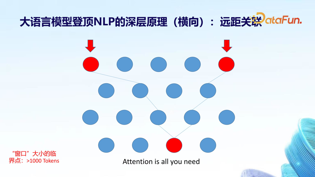 从横向看,大模型解决了 NLP 领域的一个难题——远距离上下文关联问题,即前文提到的一个词语或一段文字和后文的某一部分是相关的,然而两个词语中间的间隔可能很远,因此不同大小的窗口设定会带来不同的结果。