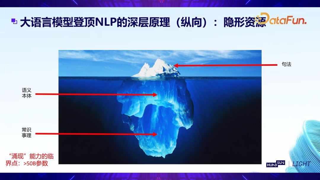 大模型的引入,利用优质的文本资源(如教科书、百科全书等正规的、优质的书籍),正确地学习和使用语义本体知识以及常识事理知识,通过大量优质文本的训练,将知识及背后模式挖掘出来。当模型参数超过 500 亿时,往往会产生质变,出现一种涌现能力,而这种涌现能力也是和隐形资源的体量直接相关的。
