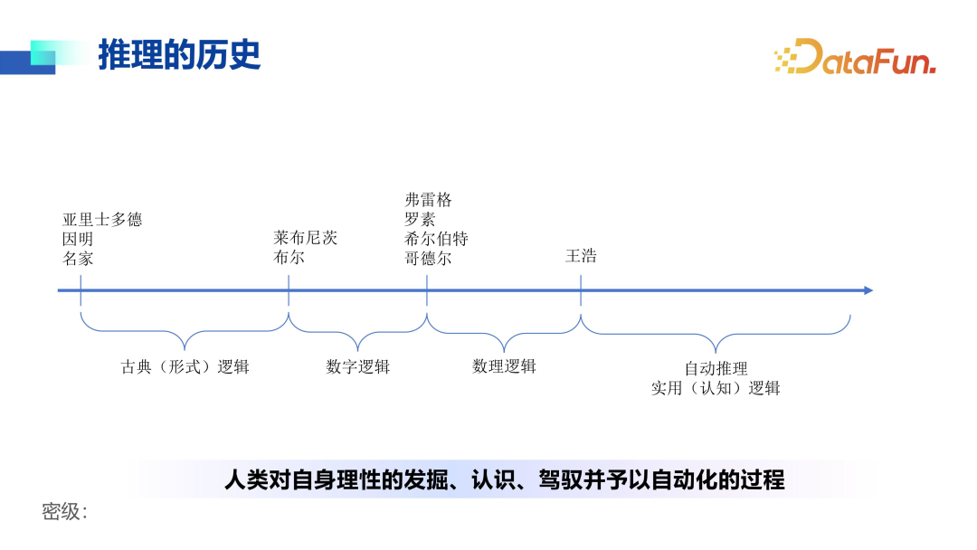 追踪推理的历史,如上图所示,从古希腊到中国,从古代到现代,从数理逻辑到自动推理,实际上是人类对自身理性的发掘、认识、驾驭,最终实现自动化的过程。