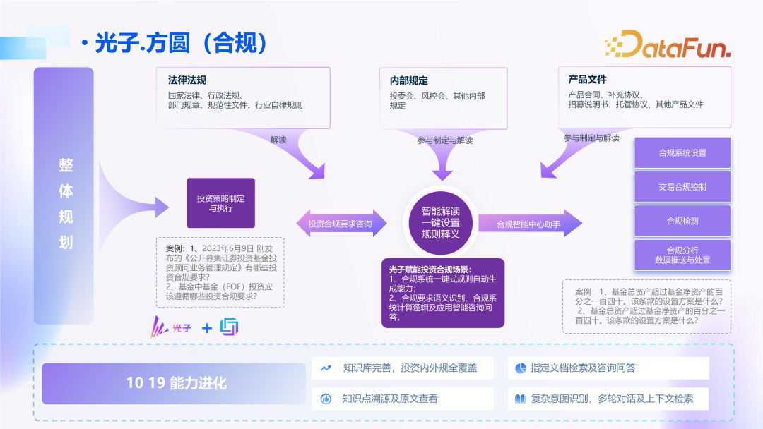 第二个是合规场景,基于内外部法律法规、规章制度,从检索询问到解读和设置,一直到应用。