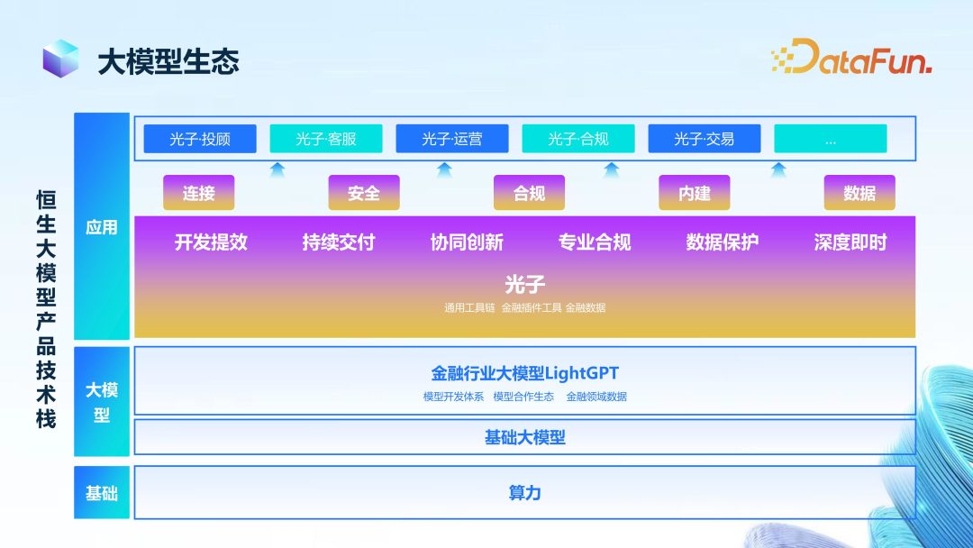 在恒生大模型生态中,算力实际上是在最底层的,基础大模型是通用能力,不特意面向某个专业领域(实际上优秀的基础大模型的专业能力也是不可小觑的);而所谓行业大模型,其中一个重要理念是站在巨人的肩膀上,即:如果基础大模型在专业上已经做得足够好,那我们就可以少做点事;如果基础模型做得还不够好,那我们就多做点事 。举个例子,假如开源大模型比较“笨重”,难以进行私有化部署,那我们就提供私有部署;假如该模型已经提供私有部署,且体量适中,那我们的压力就会大大减轻。总之,我们是站在巨人的肩膀上,避免重复造轮子。