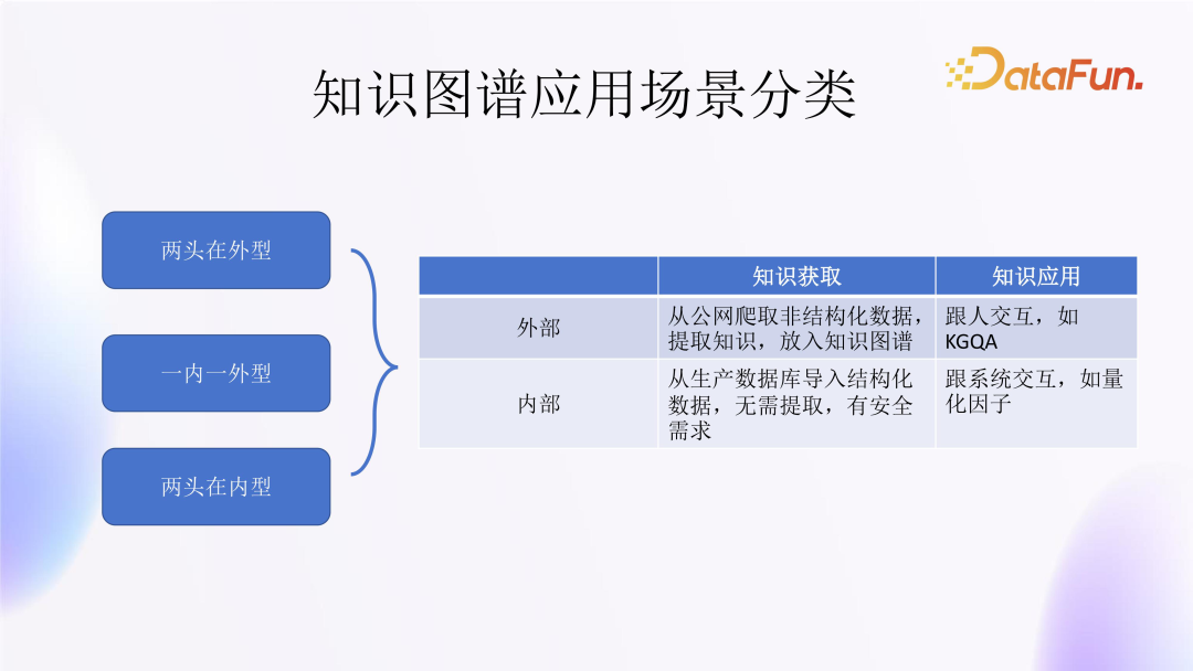 首先,要看知识的来源是内部还是外部;其次,要考虑知识图谱的应用对象是与人交互还是与系统交互。不同的应用场景,实际情况大不相同。