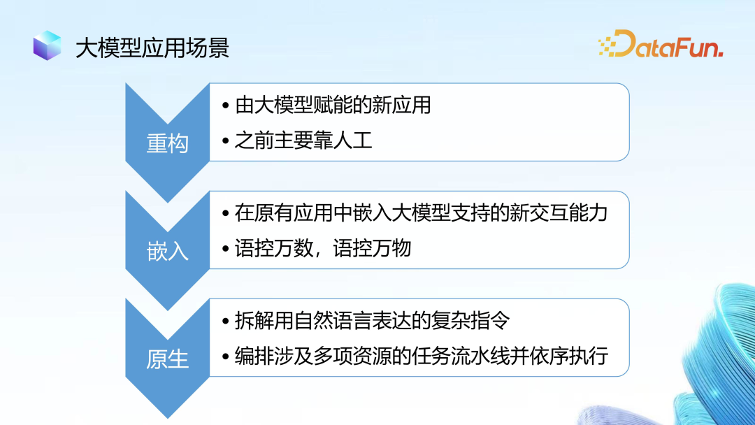 以上是大模型的三种常见应用场景,其中重构类型和嵌入类型相对简单,目前已有典型的落地场景案例。而在原生场景中,需要较强的任务拆解、任务规划、任务执行等能力,同时还要具备较强的语言理解能力、计算能力和资源对接能力,这是后面需要着重完善的地方。