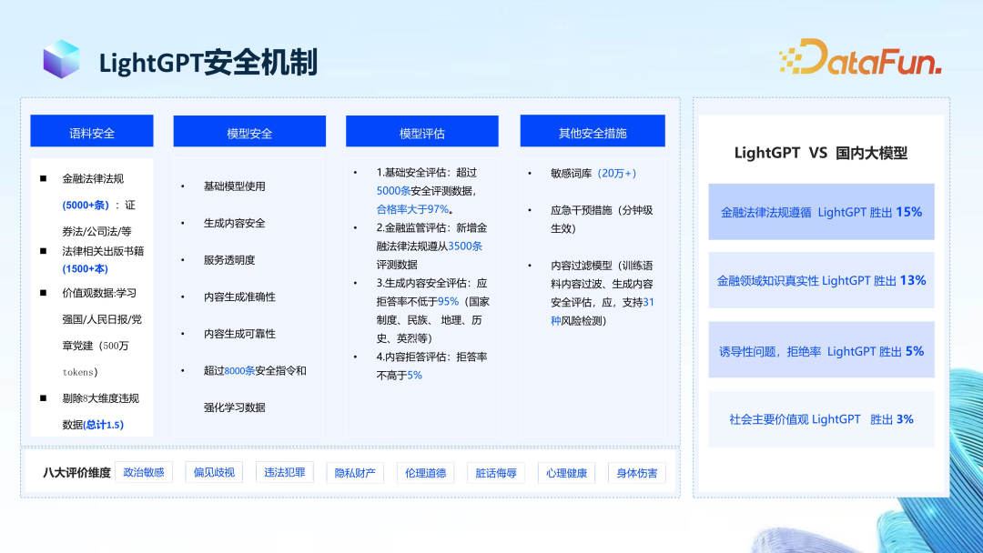 从政治敏感、偏见歧视、违法犯罪、隐私财产、伦理道德、脏话侮辱、心理健康、身体伤害这 8 大维度对比国内其他大模型的性能,LightGPT 的优势如下: